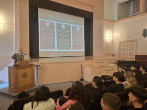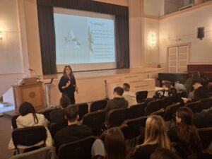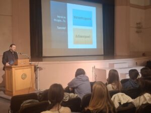 - Ο κ. Νικόλαος Ραπτόπουλος, Αναπληρωτής Καθηγητής τού Τμήματος Διεθνών & Ευρωπαϊκών Σπουδών του Πανεπιστημίου Πειραιώς, μίλησε στους/στις μαθητές/τριές μας σχετικά με το επάγγελμα του διεθνολόγου και τις ποικίλες εξειδικεύσεις που προσφέρει το Τμήμα του, όπως τα Διεθνή Οικονομικά, η Εξωτερική Πολιτική, η Ευρωπαϊκή Ολοκλήρωση, η Διπλωματία και οι Διεθνείς Σχέσεις. Ο κ. Ραπτόπουλος έκανε ειδική αναφορά στη Διπλωματική Ακαδημία και στο επάγγελμα του Διπλωμάτη και στο τέλος παρουσίασε αναλυτικά τα Εργαστήρια, τα Προγράμματα Μεταπτυχιακών Σπουδών και τις πολλαπλές επαγγελματικές διεξόδους που προσφέρει το Τμήμα του.