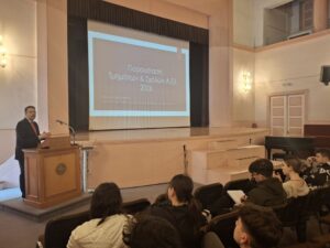 - Ο κ. Δημήτριος Μπαμπινιώτης, Αναπληρωτής Καθηγητής Αστικού Δικονομικού Δικαίου τού Τμήματος Νομικής Δημοκριτείου Πανεπιστημίου Θράκης και Δικηγόρος παρ’ Αρείω Πάγω, αρχικά, παρουσίασε διεξοδικά τους τύπους Δικαίου, καθώς και όλα τα επαγγέλματα στα οποία οδηγούν οι νομικές σπουδές. Στη συνέχεια, ανέλυσε τόσο τα τυπικά προσόντα, όσο και τις ικανότητες, τις δεξιότητες και τα στοιχεία προσωπικότητας που απαιτούνται για την επιτυχή άσκηση του νομικού επαγγέλματος. Ο κ. Μπαμπινιώτης προσέγγισε ποικίλα θέματα τα οποία αφορούν στην επίδραση της τεχνητής νοημοσύνης στα νομικά επαγγέλματα και, τέλος, τόνισε ότι οι μεταπτυχιακές σπουδές, είτε στην Ελλάδα είτε στο εξωτερικό, αποτελούν ένα σημαντικό εφόδιο για έναν νέο πτυχιούχο Νομικής.