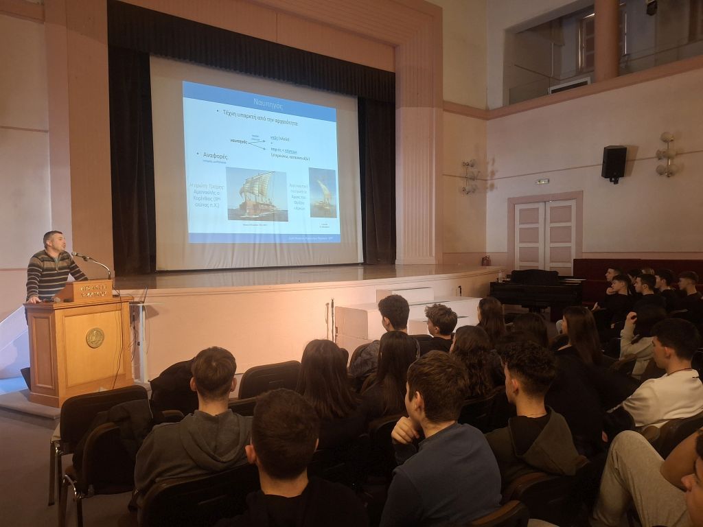 - Ο κ. Εμμανουήλ Αγγέλου, Επίκουρος Καθηγητής τής Σχολής Ναυπηγών Μηχανολόγων Μηχανικών του Εθνικού Μετσόβιου Πολυτεχνείου, παρουσίασε ενδελεχώς στους/στις μαθητές/τριές μας τις πολλαπλές εκφάνσεις και τη σπουδαιότητα τής εργασίας τού Ναυπηγού Μηχανικού, με άξονα τον σημαντικό ρόλο που διαδραματίζει η ελληνική ναυτιλία στην οικονομία της χώρας μας. Επίσης, αναφέρθηκε διεξοδικά στους τομείς σπουδών της Σχολής του, οι οποίοι περιλαμβάνουν τη Μελέτη Πλοίου και τις Θαλάσσιες Μεταφορές, τη Ναυτική και Θαλάσσια Υδροδυναμική, τη Ναυτική Μηχανολογία και τις Θαλάσσιες Κατασκευές.