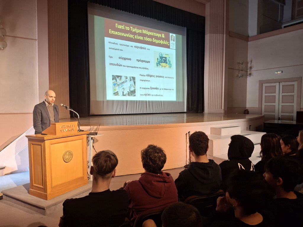 - Ο κ. Κωνσταντίνος Καμινάκης, Επίκουρος Καθηγητής του Τμήματος Μάρκετινγκ & Επικοινωνίας του Οικονομικού Πανεπιστημίου Αθηνών ενημέρωσε διεξοδικά τους/τις μαθητές/τριές μας αναφορικά με το περιεχόμενο των σπουδών και τις εξαιρετικές επαγγελματικές προοπτικές που προσφέρει το Τμήμα του. Ο κ. Καμινάκης έδωσε έμφαση στη συνεισφορά του Τμήματος ως προς την εξειδίκευση στις σημαντικότερες τάσεις της αγοράς και την ενδυνάμωση κρίσιμων προσωπικών δεξιοτήτων (soft skills) των φοιτητών, όπως είναι η κριτική και η αναλυτική σκέψη, η συνεργατικότητα και η επιχειρησιακή ηθική.