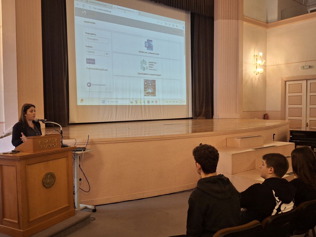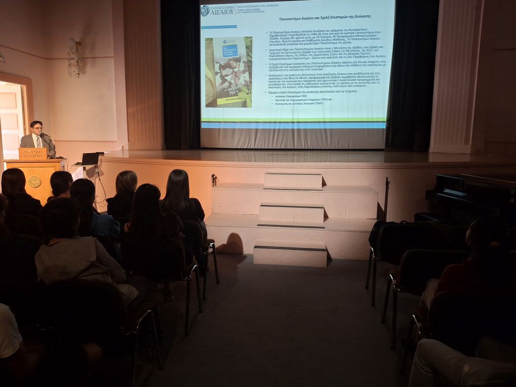 - Ο κ. Ανδρέας Παπαθεοδώρου, Πρόεδρος τού Τμήματος Οικονομικής και Διοίκησης Τουρισμού Πανεπιστημίου Αιγαίου, αφού ανέλυσε στους/στις μαθητές/τριες μας τον σημαντικό ρόλο που διαδραματίζει ο ελληνικός τουρισμός στην οικονομία τής χώρας μας, παρουσίασε διεξοδικά τις πολλαπλές επαγγελματικές διεξόδους τις οποίες μπορούν να ακολουθήσουν οι πτυχιούχοι των Τμημάτων Τουριστικών Σπουδών των Ελληνικών Πανεπιστημίων. Στη συνέχεια, ο κ. Παπαθεοδώρου έδωσε με εύληπτο τρόπο στους/στις μαθητές/τριές μας την ταυτότητα τού Τμήματος, στο οποίο είναι επικεφαλής, καθώς και τα πλεονεκτήματα που προσφέρει η φοιτητική ζωή σε μια πόλη της περιφέρειας.